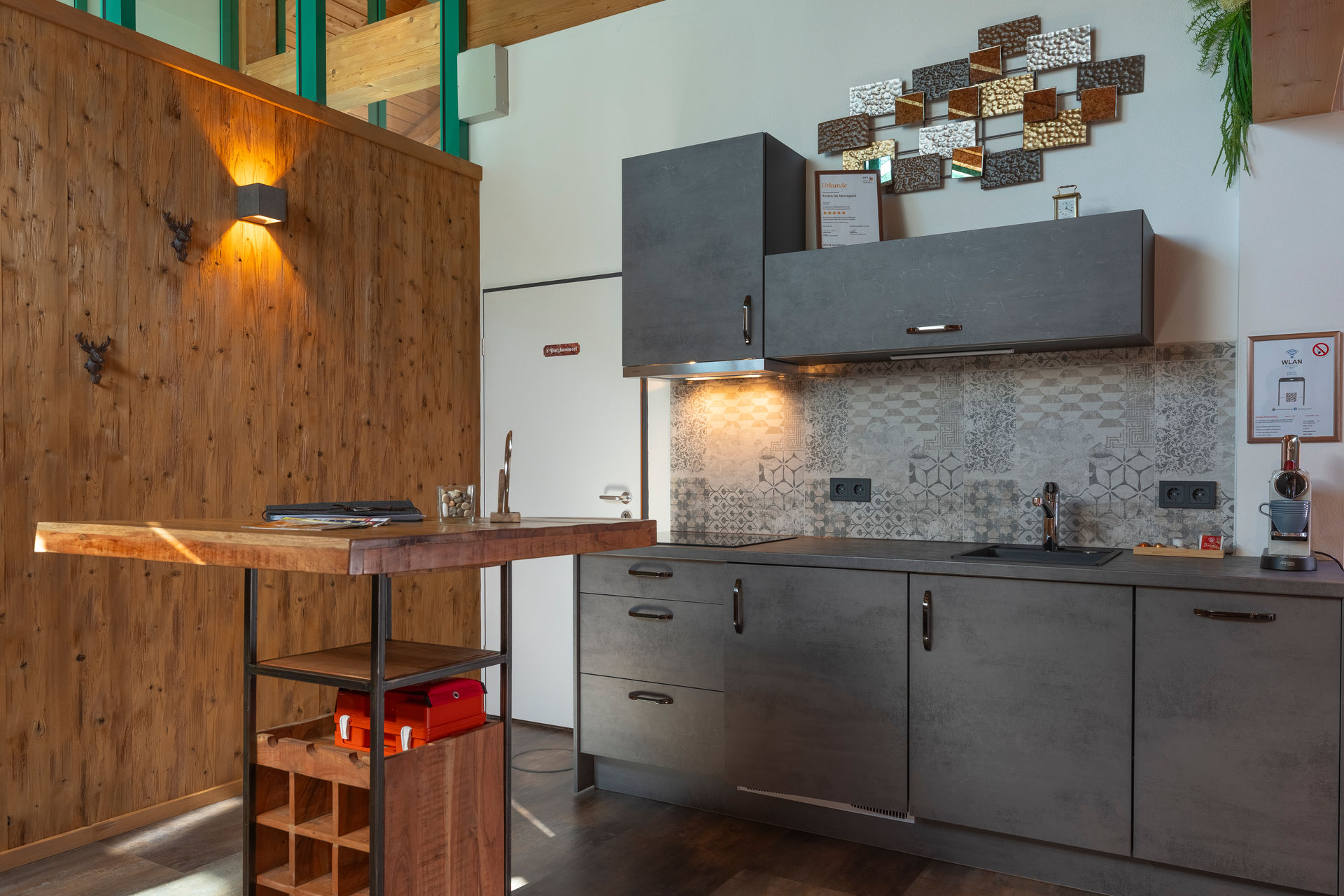 mit gemütlicher Couchecke, integrierter Küche und großem Familienesstisch, Geschirrspüler, Herd, Kaffeemaschine, Küchenutensilien, Kühlschrank, Tiefkühlfach, Wasserkocher, ein Teufl-Radio mit Bluetooth, Weingläser, Gewürze, Kaffee und Tee. Dennoch auch ein Essbereich am Balkon im Freien mit Bergblick